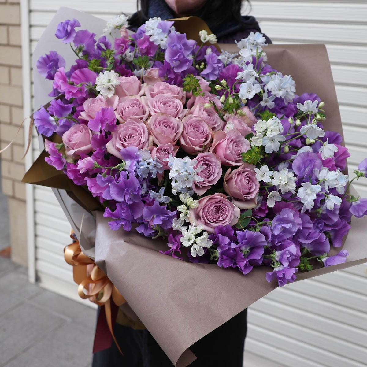 お祝いに豪華な紫の花束を